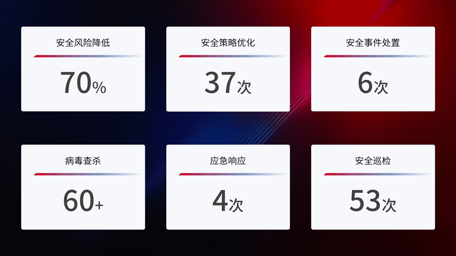 提供全面的安全事件报告体系,,,包括处置报告、、周报、、季度和年度总结,,,,结合持续监控,,,,帮助客户深入了解网络安全状况。。。。