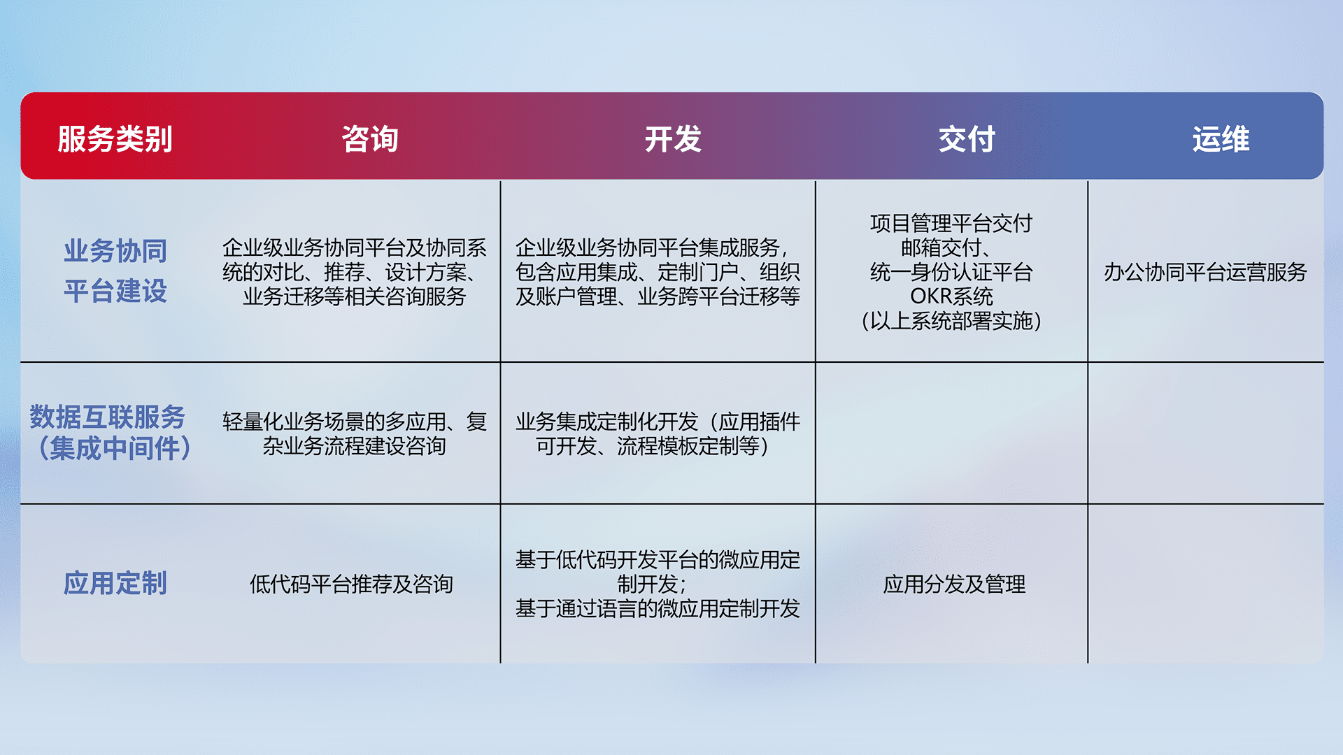 针对钉钉、、企微、、、、IDaas等平台级产品提供产品的规划、、方案、、、、交付、、、、定制化开发等服务,,,,实现如统一协同办公、、智能客户服务、、、、混合会议管理、、智能数据查询、、等业务场景,,,实现数字化转型。。。