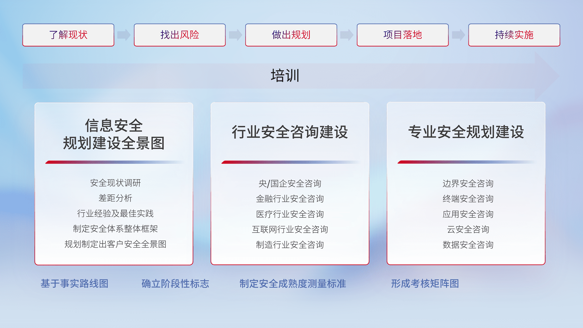 梳理客户信息安全现状调研、、差距分析结果,,,,结合行业先进经验及最佳实践,,制订客户的信息安全管控体系总结架构,,最终形成一个完整的客户信息安全规划与建设的全景图。。