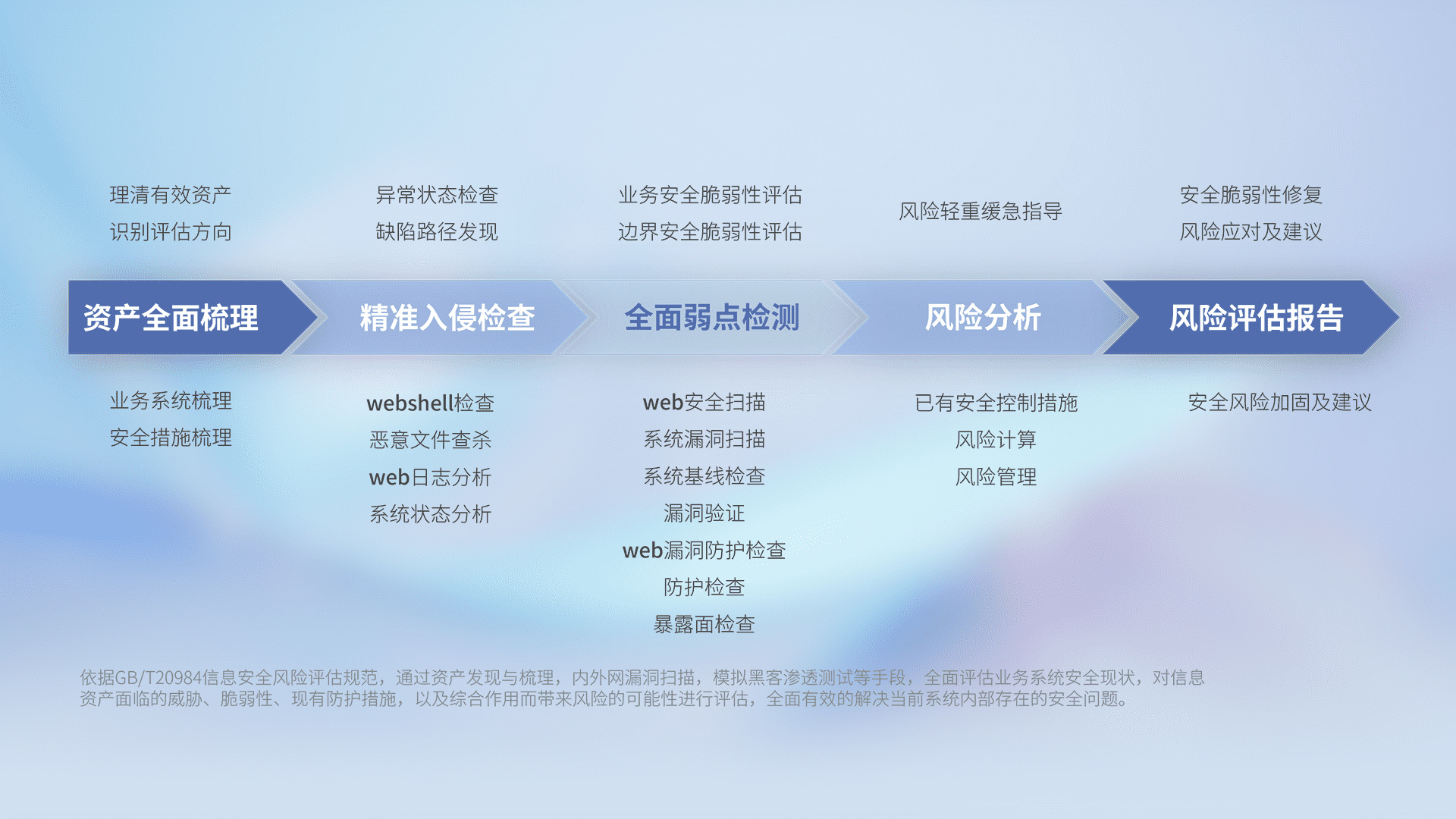 针对客户行业特性,,,,以专业的安全服务+多厂商联合解决方案提供专属的一站式安全管理服务,,,,帮助客户全面感知网络空间威胁,,基于识别、、检测、、分析、、、防护、、、监测、、响应的服务理论模型,,,从方案咨询、、集成交付、、、、评估验证、、优化加固、、运维运营,,,,致力于为客户提供完整的闭环管理式安全服务。。以实战经验为客户打造高抵御风险的安全体系,,,帮助客户发现威胁、、对抗威胁、、处置威胁,,,,不断积累安全对抗能力,,持续保障数字化安全。。。